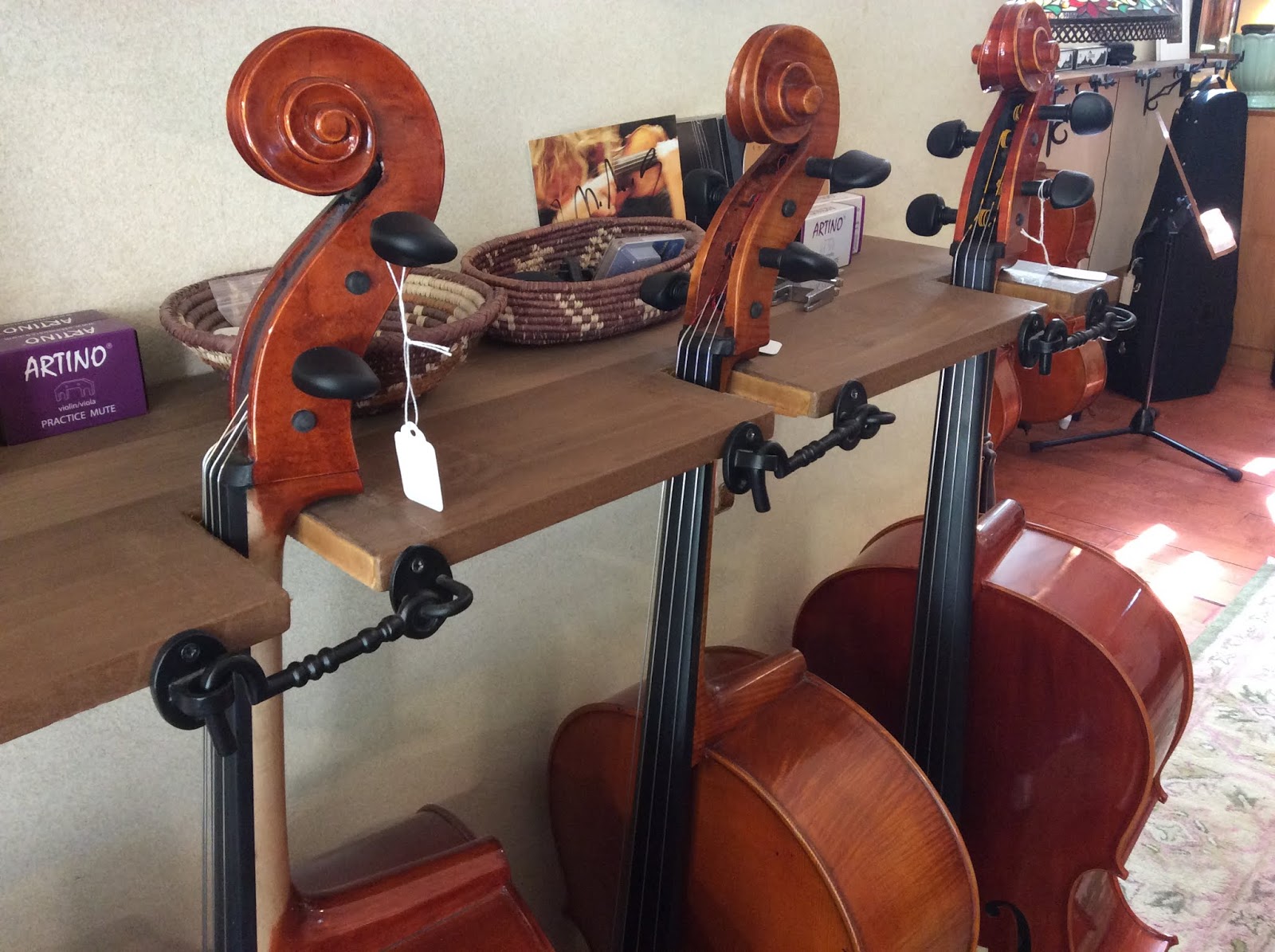 In our shop, Andy, our luthier, has made cello racks out of wood boards and latches. It can be a pretty effective way to store multiple cellos since it takes up less space than multiple stands. Just make sure to mount onto wall studs so it's sturdy enough!